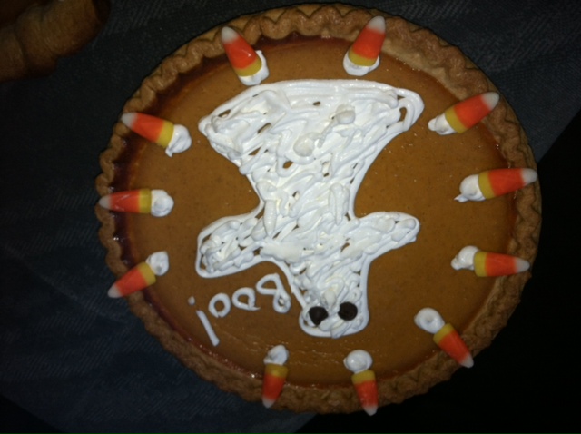 I’d like to start off by showing pictures of the cute pies I delivered this morning. I sent the “Little Boo” to my friend Olivia. The “Big Boo” went to my son’s second grade teacher, and another “Big Boo” went to the front office staff at his school. I thought the candy corns looked great on those pumpkin pies.