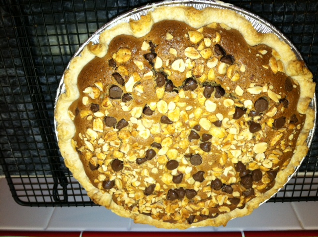 The finished pie ends with peanuts on top of the last layer of chocolate. Crunchy, salty goodness. Then it all goes into the freezer for six hours. Just enough time before tonight’s trick-or-treating fun with friends. I’ll be taking three pies over there tonight: Velvet Elvis, a pumpkin pie from last night, and a second lemonade pie that I made this morning before the Elvis Pie. That ought to be enough for everyone to have something they like.