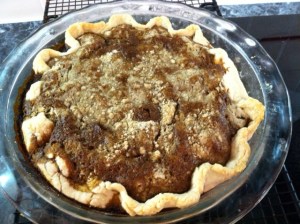 After I poured the filling into the chilled homemade crust, I put the butter crumble on top. The recipe said not to tamp it down, so I didn’t. Not that I could have if I’d wanted to–the stuff just sorta sank in the stink pool and eventually built up on top. Then it baked for 10 minutes at one temperature and 25 minutes at another.