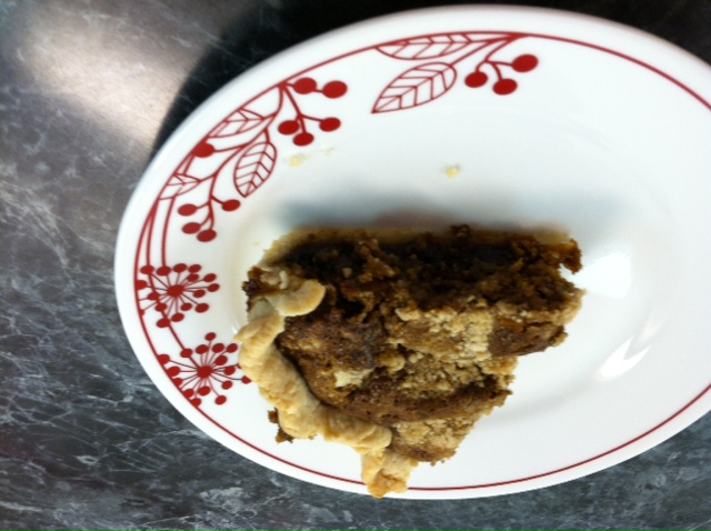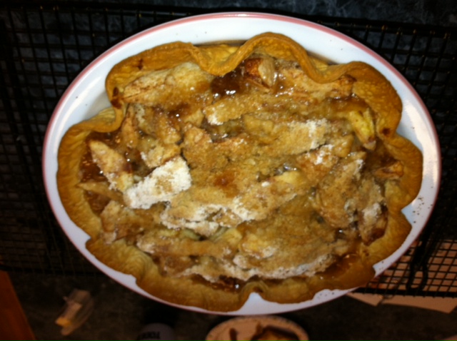 It really was science in the kitchen, because I couldn’t believe that it turned into an actual pie. The crust did not really behave–it kinda fell in a bit. But it turned out, somehow. It even produced a very nice slice.