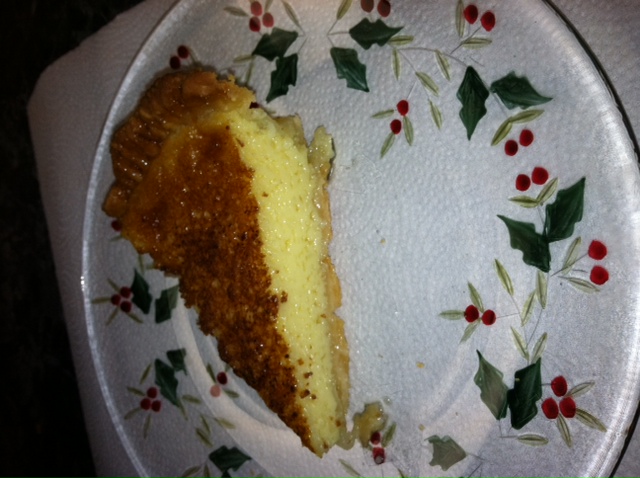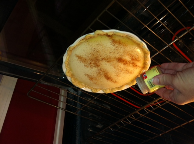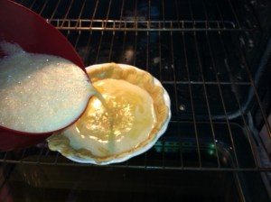 Anyway, I just decided to dump the yolks in there, too. And I kept on whisking. It thickened up very nicely, and I added a little butter and vanilla. I tasted a bit (quite yummy) and poured it into the pitiful Ugly Crustling.