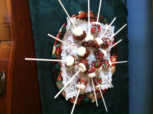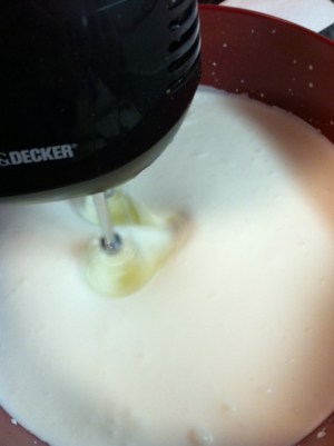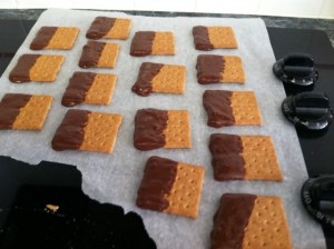 To prepare chocolate gananche, use a double boiler on the stove top. (This means to simmer some water in a saucepan and put a bowl over it to melt stuff. You use a double boiler when you don’t want chocolate to get burned.) In the bowl, combine half and half, chocolate chips, and vanilla. Stir until melted over medium heat. Remove from heat and allow to cool for about five minutes.
