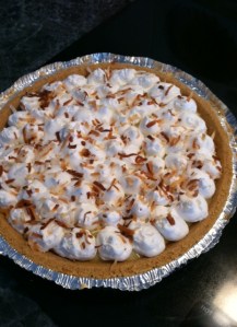I got to do something new while I was preparing to top the pie–toasting coconut. It smells wonderful while it’s in the oven and man, I cannot believe how toasting brings out the flavor. On top of that, it gets this crispy texture that is just divine.